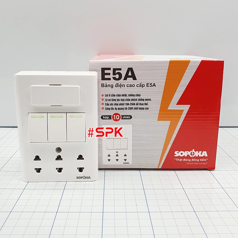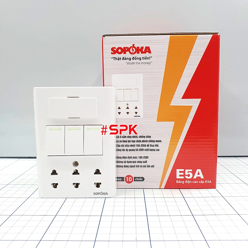 Từ khóa: Bảng điện cao cấp SOPOKA, bảng điện E5A, bảng điện 3 công tắc 3 ổ cắm, bảng điện lắp nổi, ổ cắm điện cao cấp, bảng điện an toàn, thiết bị điện SOPOKA, bảng điện cho gia đình, bảng điện văn phòng.