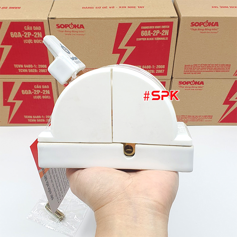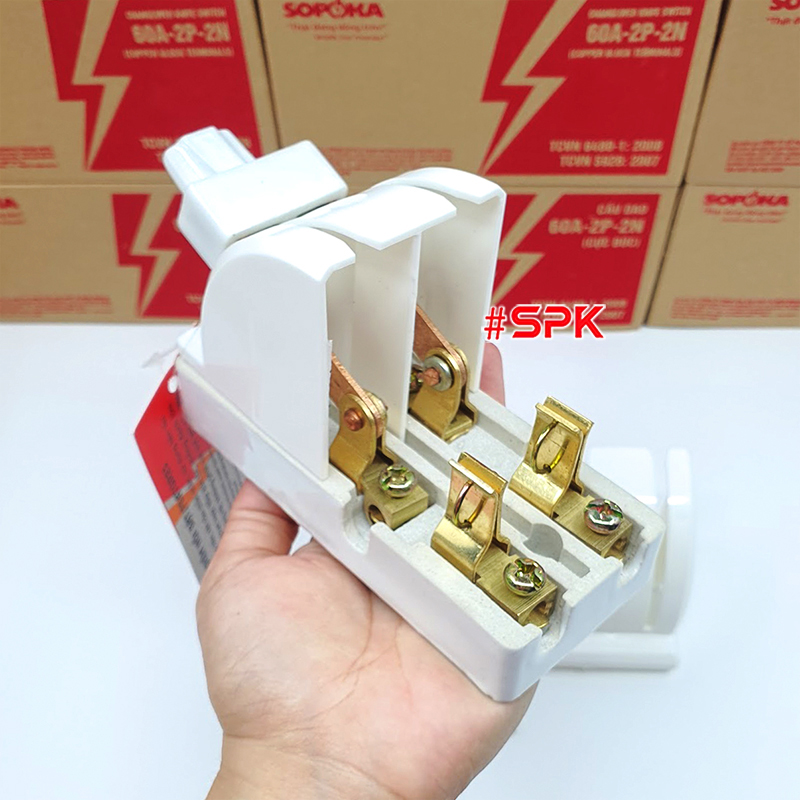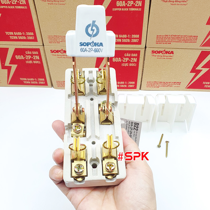 Cầu Dao Đảo Đế Sứ 1 Pha 60A 2P 600V 2N D22 SOPOKA là dòng cầu dao đảo chiều cực đúc dành cho hệ điện 1 pha. Sản phẩm nổi bật ở đế sứ cách điện chịu nhiệt, cơ cấu lò xo tăng lực giúp đóng cắt êm, cực đồng hợp kim nguyên khối cho độ dẫn điện cao và tản nhiệt tốt. Cấu trúc vỏ ABS dày, gân cứng tăng độ vững, hỗ trợ dập hồ quang khi thao tác đóng điện, phù hợp cả môi trường dân dụng lẫn xưởng sản xuất có yêu cầu ổn định và an toàn.