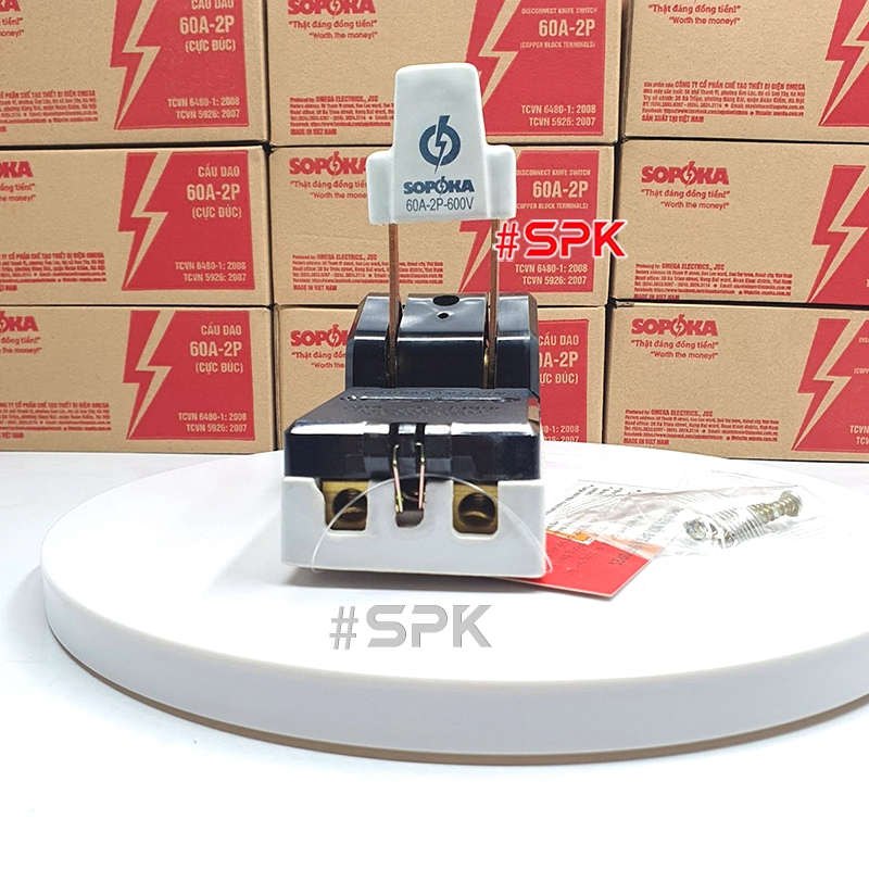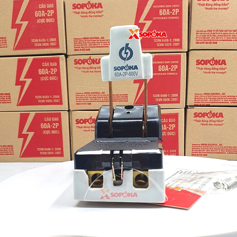 Cầu dao đế sứ 1 pha 60A-2P màu đen D7(A) SOPOKA là cầu dao cơ công suất trung bình, dùng để đóng cắt và cách ly mạch điện 1 pha có dòng định mức tới 60A trong tủ điện gia đình, cửa hàng, nhà xưởng nhỏ hoặc các tủ phân phối nhánh. Thiết kế đế sứ chịu nhiệt kết hợp cực đúc bằng đồng hợp kim giúp dẫn điện ổn định, phù hợp cho nhiều loại tải 1 pha cần thao tác đóng cắt rõ ràng.