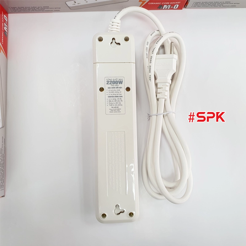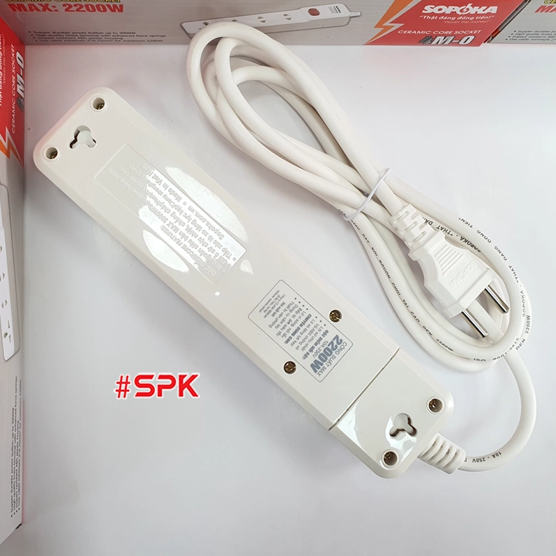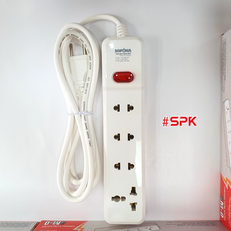 Ổ cắm điện 4 lỗ 2200W lõi sứ có dây và công tắc 4M2 SOPOKA là sản phẩm chất lượng cao với khả năng chịu tải lên đến 2200W, thiết kế lõi sứ chịu nhiệt, chống cháy hiệu quả. Với 4 lỗ cắm (3 lỗ hai chấu và 1 lỗ ba chấu đa năng) cùng nút công tắc chịu tải lên tới 3000W, sản phẩm mang đến sự an toàn, tiện lợi và linh hoạt cho người dùng tại gia đình và văn phòng. Dây điện đi kèm có nhiều lựa chọn chiều dài 2.5m, 4.5m và 9m, đáp ứng đa dạng nhu cầu sử dụng.