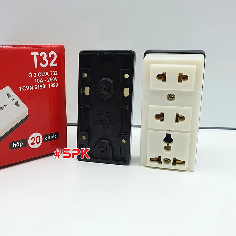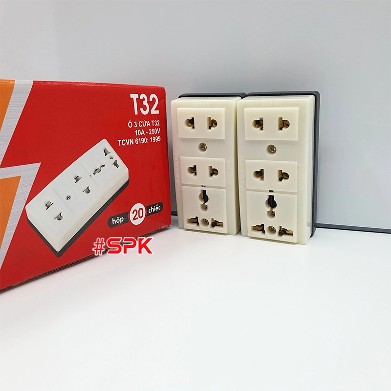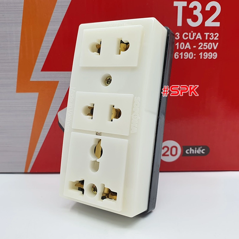 T32 là ổ cắm gắn táp-lô/treo tường 3 lỗ nhỏ gọn, có 1 lỗ 3 chấu đa năng, phù hợp bổ sung điểm cắm điện ở bảng điện, tủ điện, góc làm việc hoặc quầy lễ tân. Đế bakelite chịu nhiệt đến ~170°C kết hợp thân ABS chịu va đập giúp ổ cắm bền bỉ, hạn chế nứt vỡ khi thao tác thường xuyên. Cụm tiếp xúc đồng đàn hồi kèm lò xo tăng lực kẹp cho cảm giác cắm chắc tay, giảm phát nhiệt tại điểm tiếp xúc khi vận hành đúng công suất. Mức định mức 220V~ 10A (tải tối đa 2200W) đáp ứng tốt đa số thiết bị gia dụng – văn phòng thông dụng.