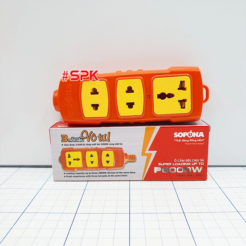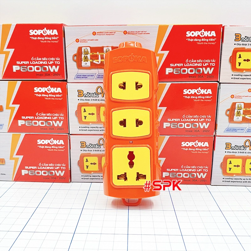 Ổ cắm điện SOPOKA 6000W có bao nhiêu lỗ cắm? Ổ cắm điện có 3 lỗ cắm (2 lỗ 2 chấu và 1 lỗ 3 chấu đa năng), phù hợp với đa dạng các loại phích cắm điện thông dụng.